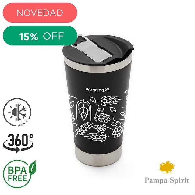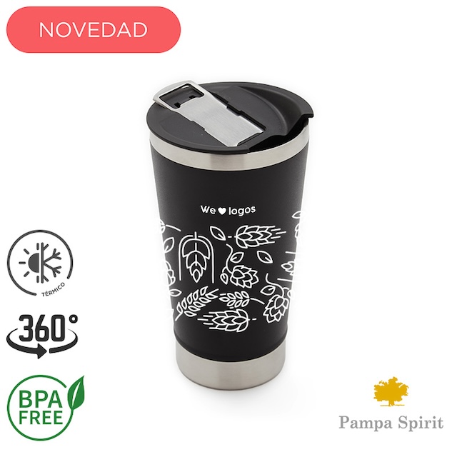Mug de doble pared de acero inoxidable con capacidad de 600 ml ¡con destapador de botellas en la tapa! Reutilizable. El producto se presenta en una bolsa de PLA 100% compostable dentro de una caja de cartón. Ideal para café, té, bebidas frías o calientes. Pampa Spirit. Incluye Gift Box confeccionada en cartulina Kraft.