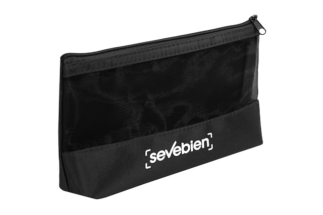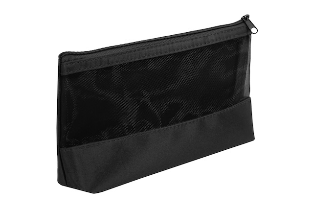 12,5 x 21 x 5,5 cm. Poliéster. Necessaire con interior del mismo color que el exterior, cierre y jalador. Cuenta en el centro con material transparente que permite ver el interior.
