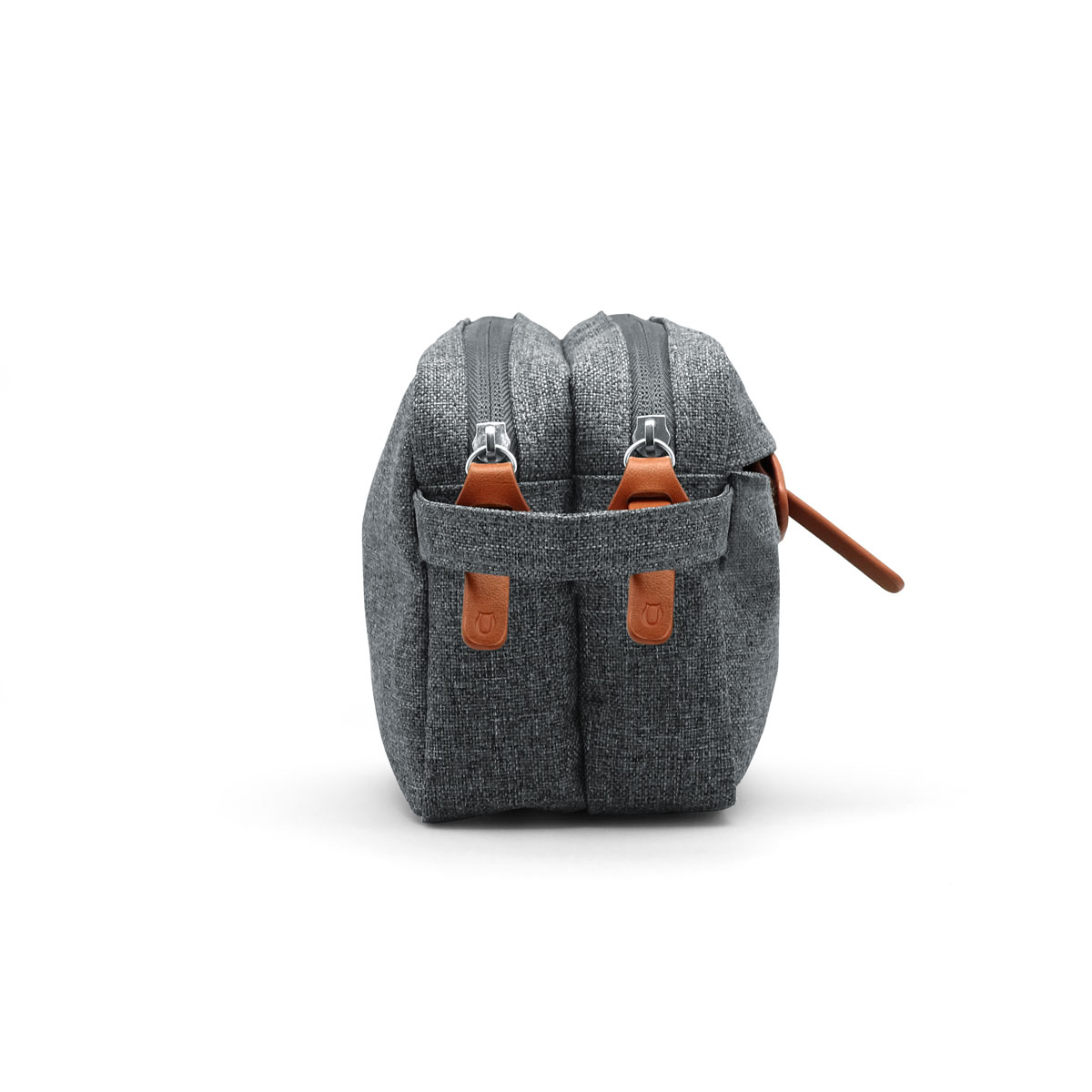 21,5 x 13,1 x 8 cm.U KIT. Poliéster, Nylon y Cuero ecológico. Necessaire. Organizador con dos compartimentos individuales forrados en el interior, un bolsillo delantero y asa para transportar.