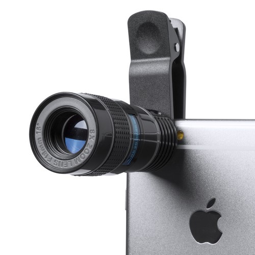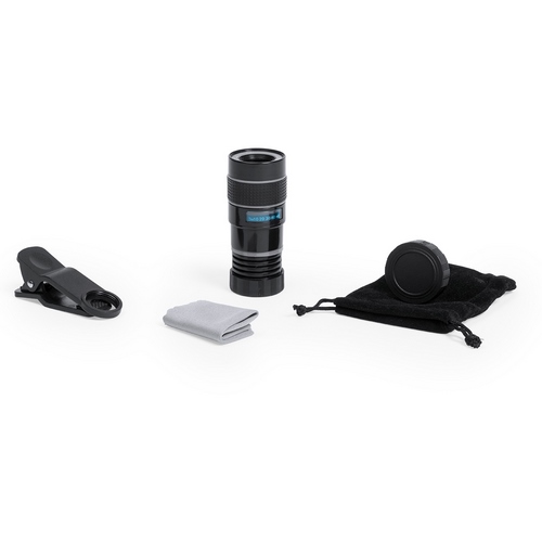 Objetivo universal para smartphone ajustable a la cámara mediante pinza. Con lentes de aumento de cristal de hasta 8x, presentada en una bolsita de terciopelo con paño limpiador incluido, todo ello dentro de una atractiva caja de presentación de diseño. Lente Cristal. Funda Poliéster