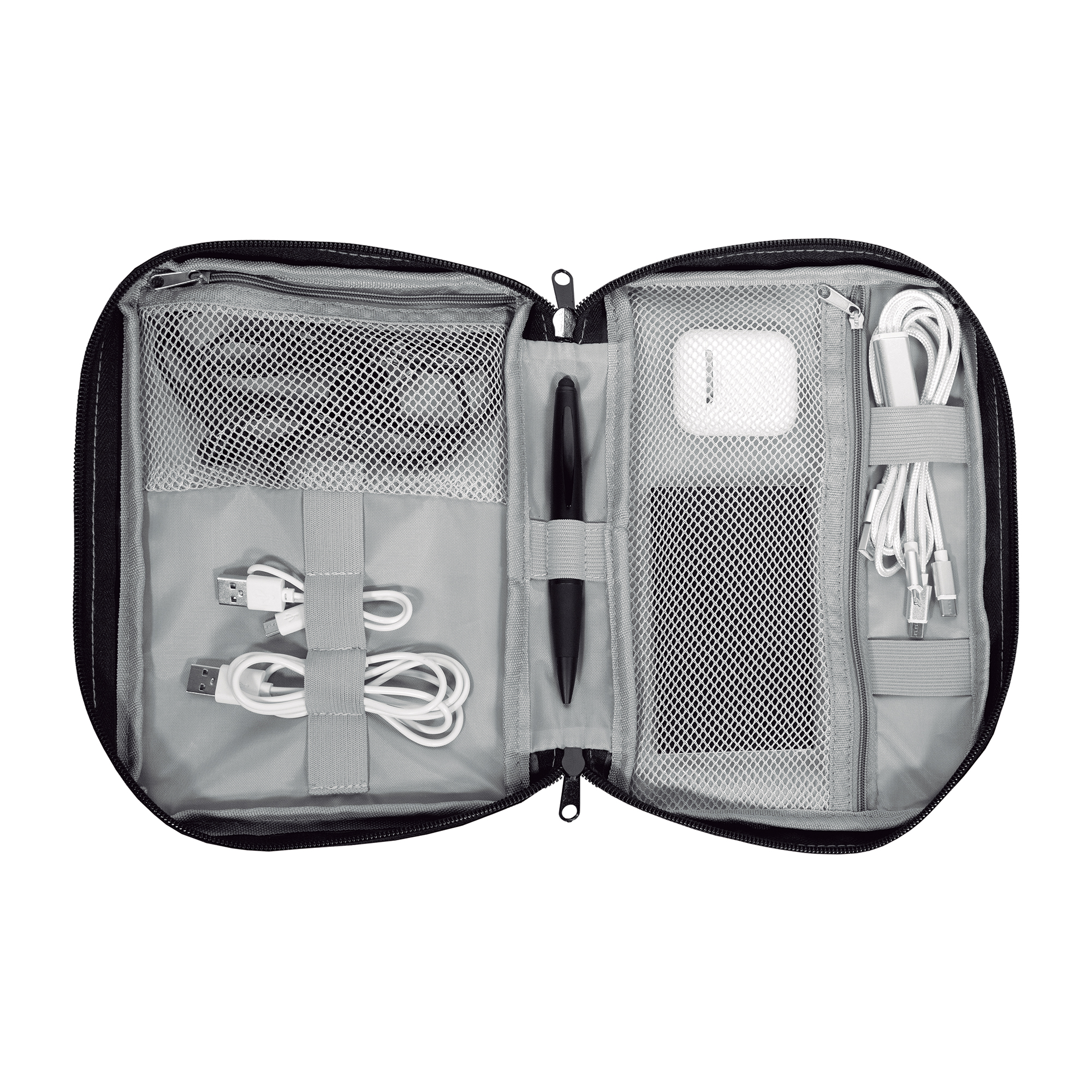 19 x 26 x 5 cm. Poliéster. Organizador para cables y accesorios. Cuenta con dos bolsillos de red con cierre. 4 elásticos que permiten arrollar y guardar los cables, 1 elástico porta bolígrafo y 2 elásticos amplios. NO INCLUYE ACCESORIOS.