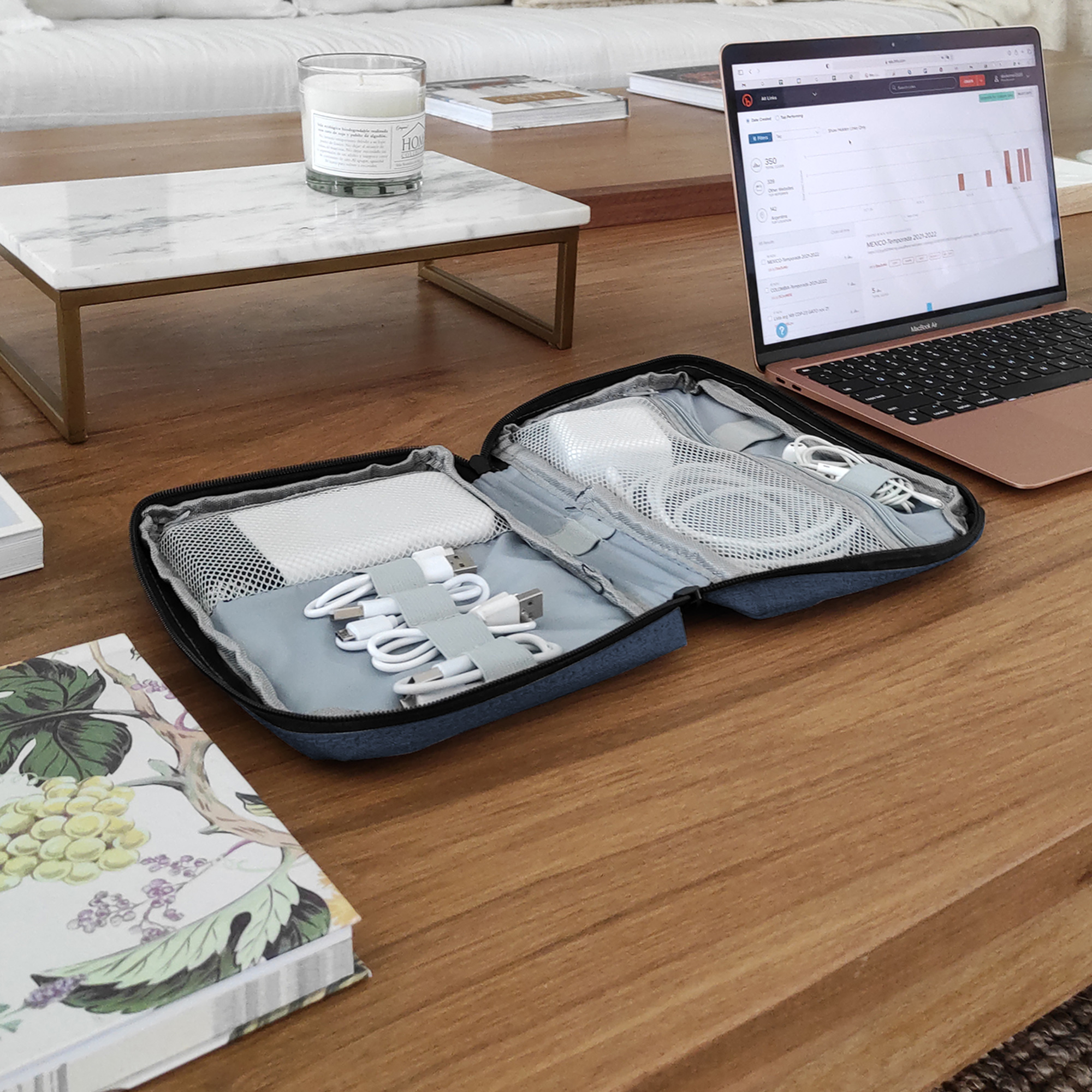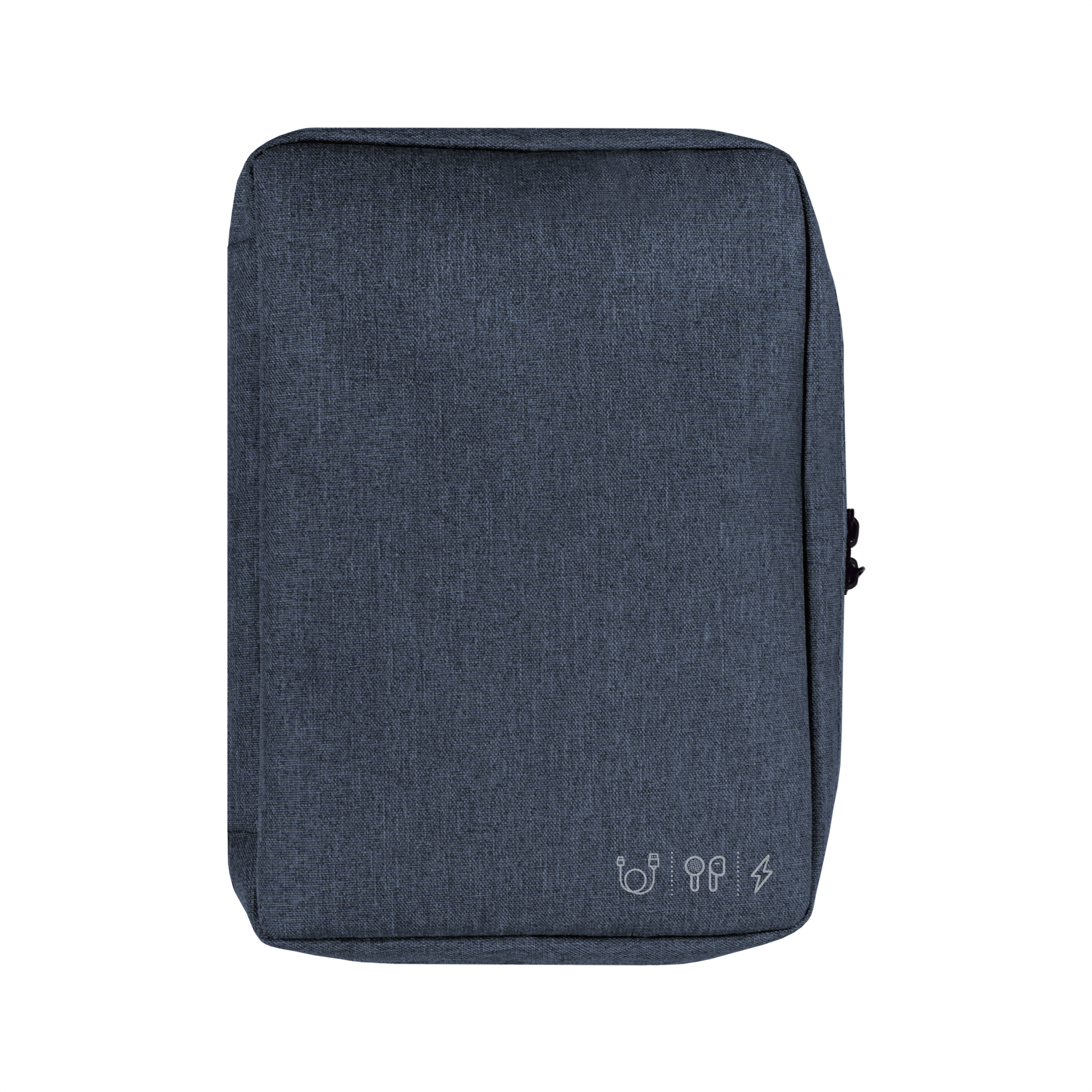 26 x 19 x 5 cm. Poliéster. Organizador para cables y accesorios. Cuenta con dos bolsillos de red con cierre. 4 elásticos que permiten arrollar y guardar los cables, 1 elástico porta bolígrafo y 2 elásticos amplios. NO INCLUYE ACCESORIOS.