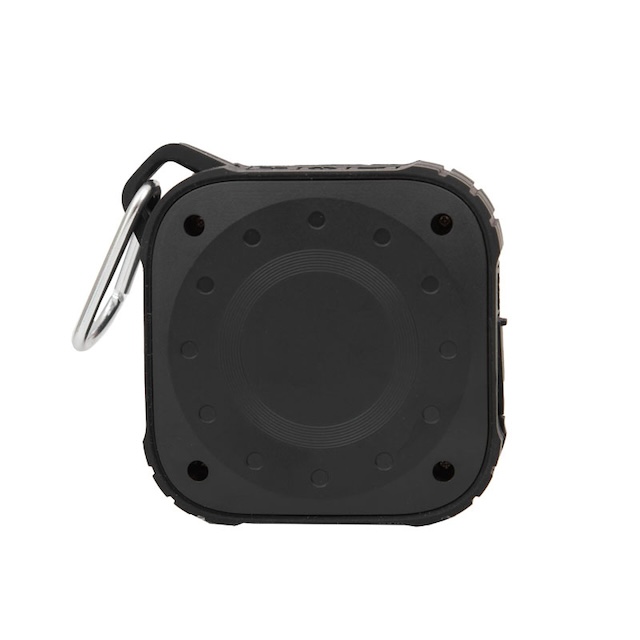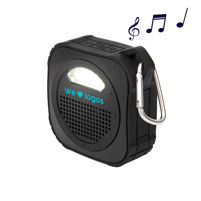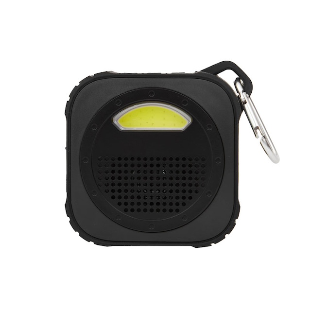 Parlante Bluetooth, con luz de 5V. Cuenta con gancho para transportarlo. Está realizado en ABS y silicona. Batería: 600mah. Medidas: 9 x 9 x 3,3 cm.