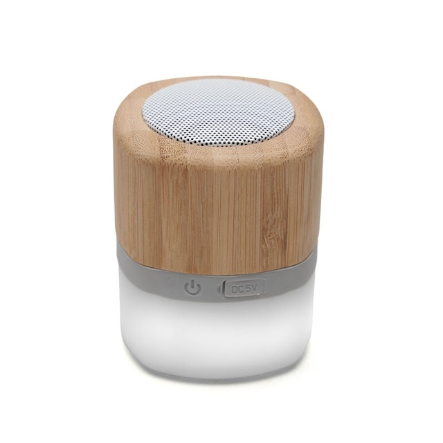 Parlante portátil con tecnología Bluetooth. Realizado en combinación de ABS con Silicona y bamboo, con iluminación en la base. Características técnicas: Batería de 300mAh | Poder del parlante: 3W | Frecuencia: 200Hz-20KHz | Conexión: 5V / 500mA | Distancia de alcance: 10 Metros | Peso 150gr | Medidas: 6 x 6 x 7,5 cm. ReUseMe. Incluye Gift Box confeccionada en cartulina Kraft.