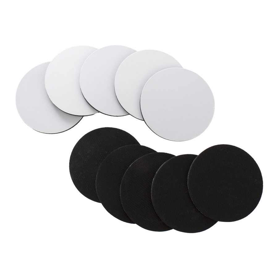 Posavaso redondo de 5mm de espesor y 10cm. de diámetro, con base de silicona negra y cubierta de tela poliéster blanco para Sublimación.