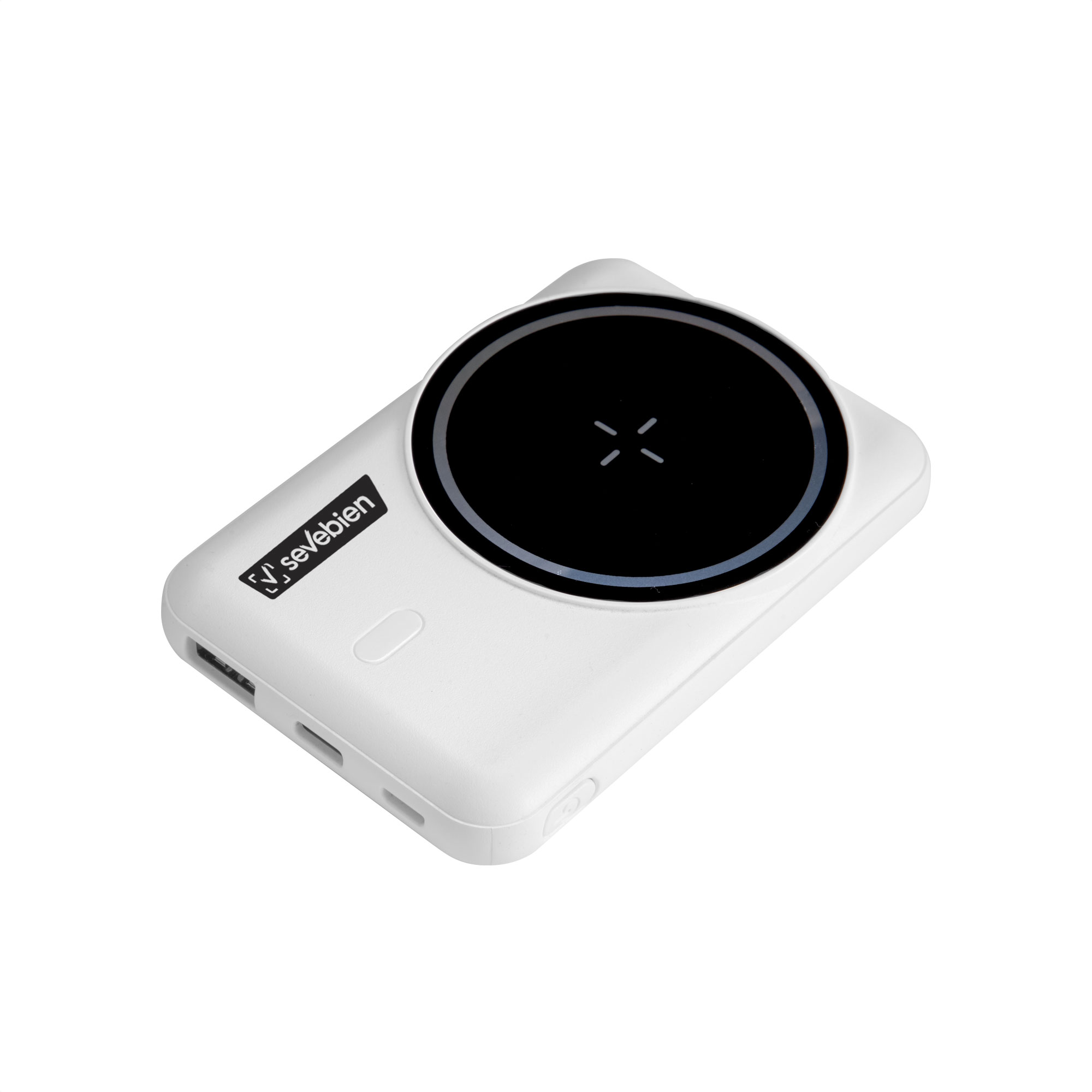 Carga sin cables, estilo sin límitesPower bank inalámbrico con aro magnético y soporte de anillo. Color blanco mate y negro brillante. Posee Entrada y salida: 5V 2A. Con 2 puertos de carga USB-C y micro USB. Función inalámbrica magnética. Potencia inalámbrica: 5W. Indicador luz led de carga. Soporte plateado rebatible al dorso. Cable de carga USB-C de 30 cm. en color blanco. Medidas: 9,4 x 6,4 x 1,6 cm.
