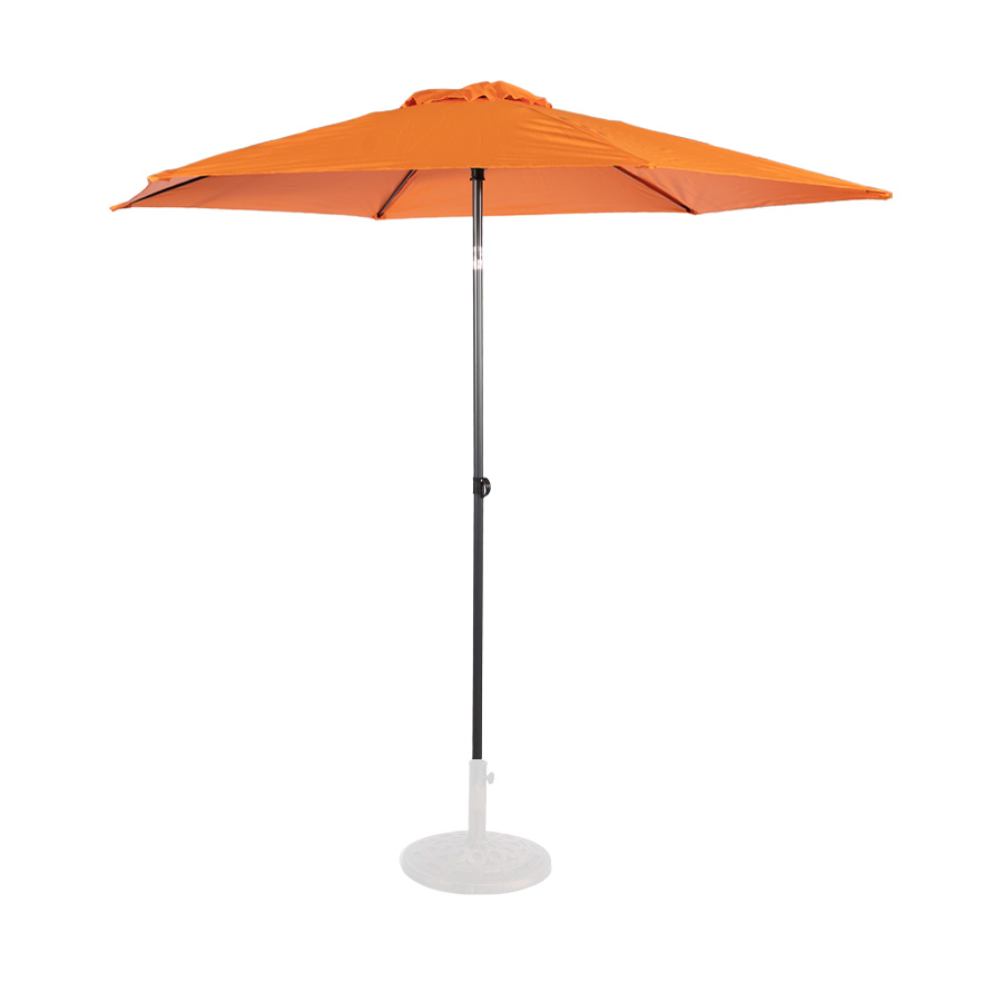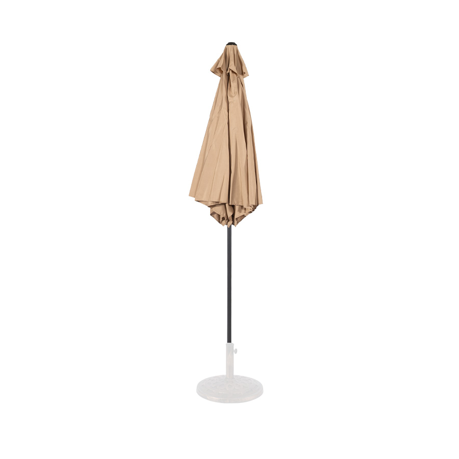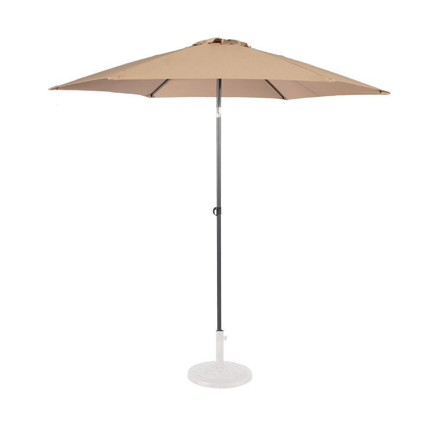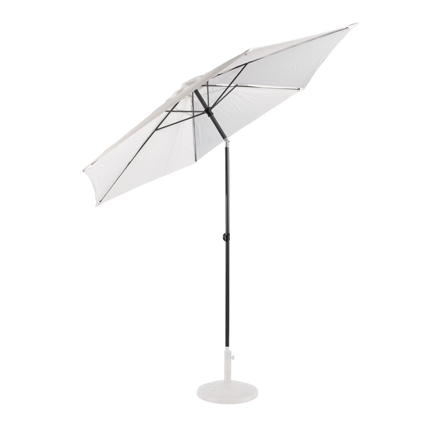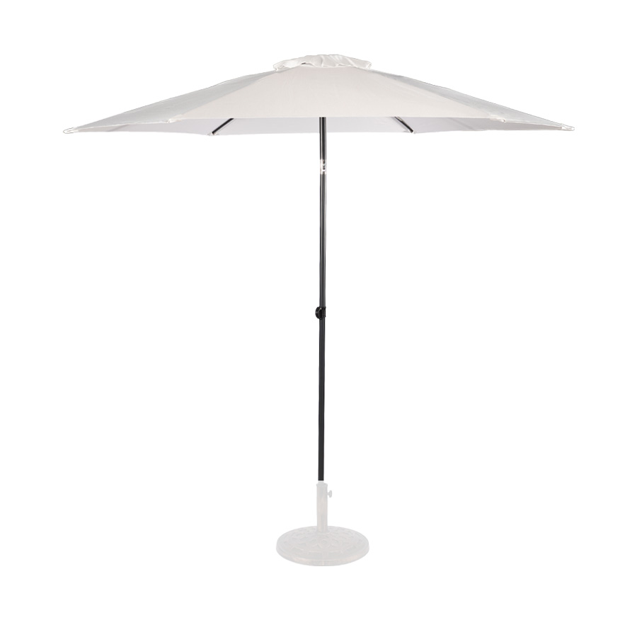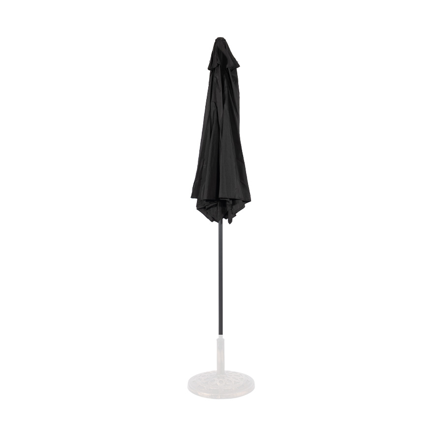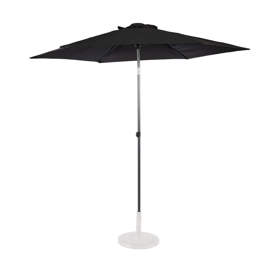Quitasol redondo modelo “RAVELLO” de 2.5m de diámetro, con 6 cascos de lona Poliéster UV impermeable de 160g. Estructura asta central de 3.2cm diámetro x 1.6mm de espesor + 6 varas de 6x10mm, ambos Acero con pintura electrostática color negro, altura 2.3m, con sencillo sistema de apertura manual. Incluye codo giratorio de 45°. NO INCLUYE BASE.
