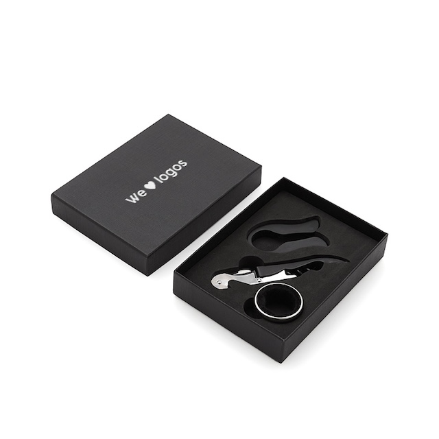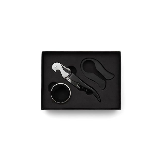 Set de accesorios de 3 piezas que necesitas para disfrutar mejor de tu vino. Incluye sacacorchos en dos tiempos, anillo cortagotas, y corta sello. Viene presentado en una caja negra de 13 x 15 cm. Ideal para hacer un regalo original y práctico a un amigo o familiar.