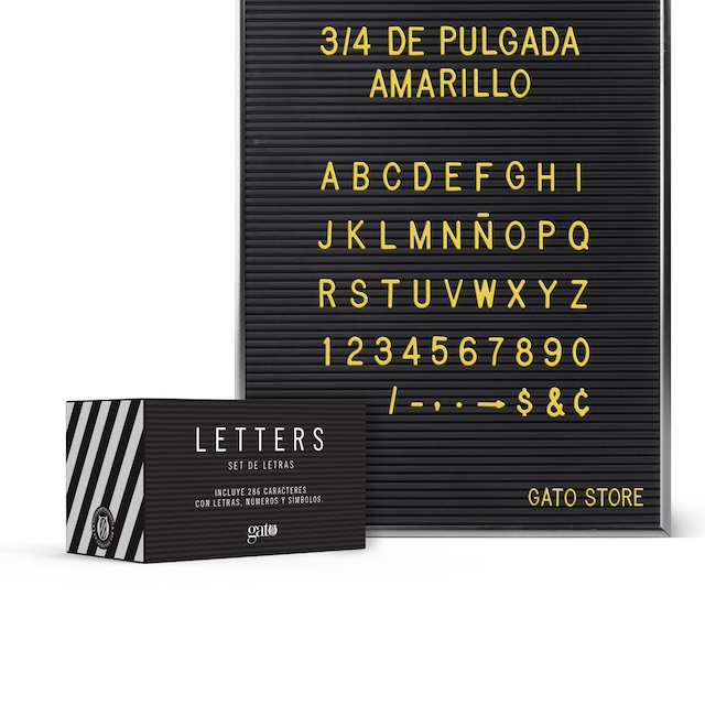 Set de 286 caracteres de 3/4 de pulgada de alto para la cartelera Letter Board. Disponible en 3 colores. Incluye letras, números y símbolos.
