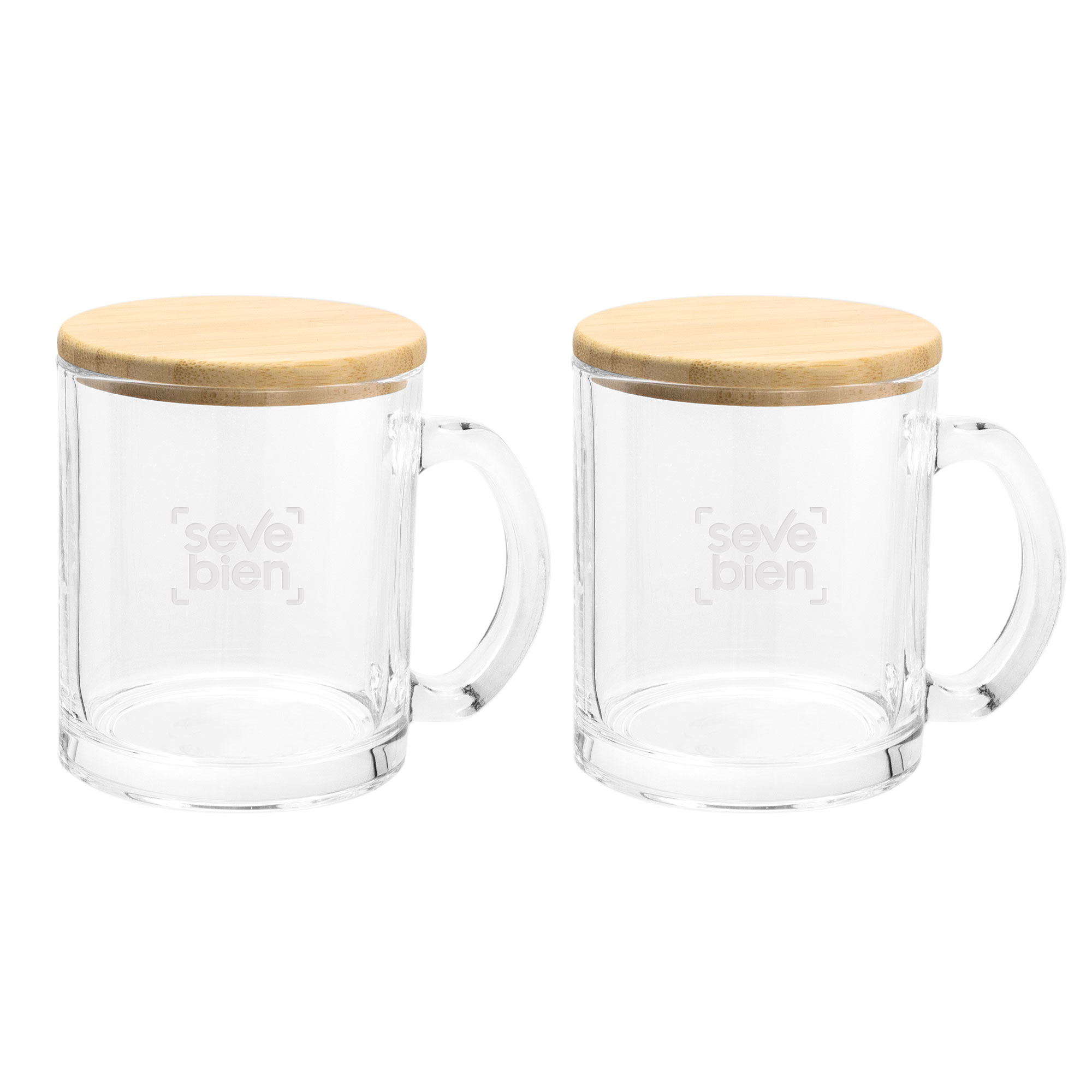 Ø 8 cm x 9,7 cm. Capacidad 350 ml. (cada taza). Vidrio + bambú. Set de dos tazas de vidrio con tapa de Bambú barnizado. Presentación en caja de regalo kraft.