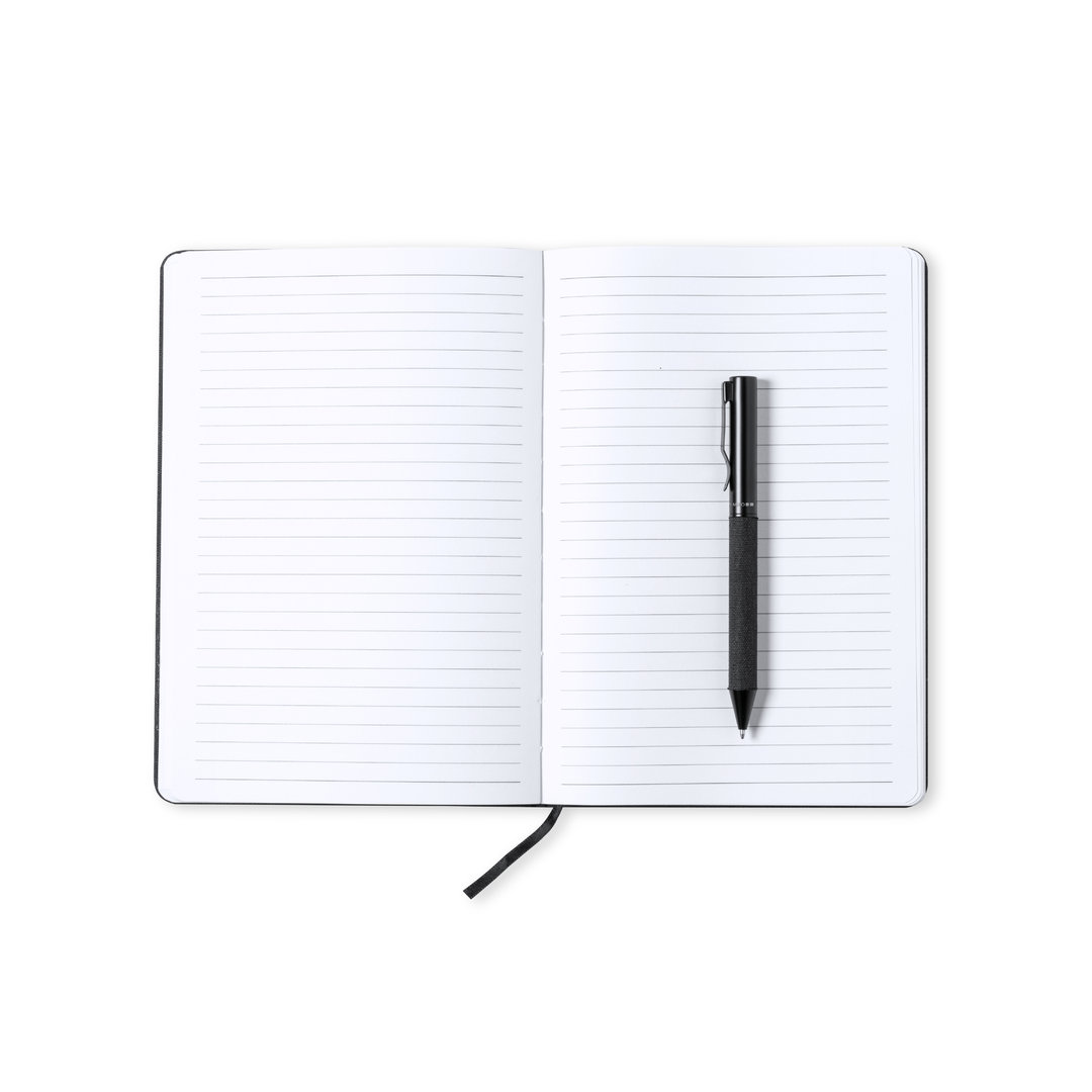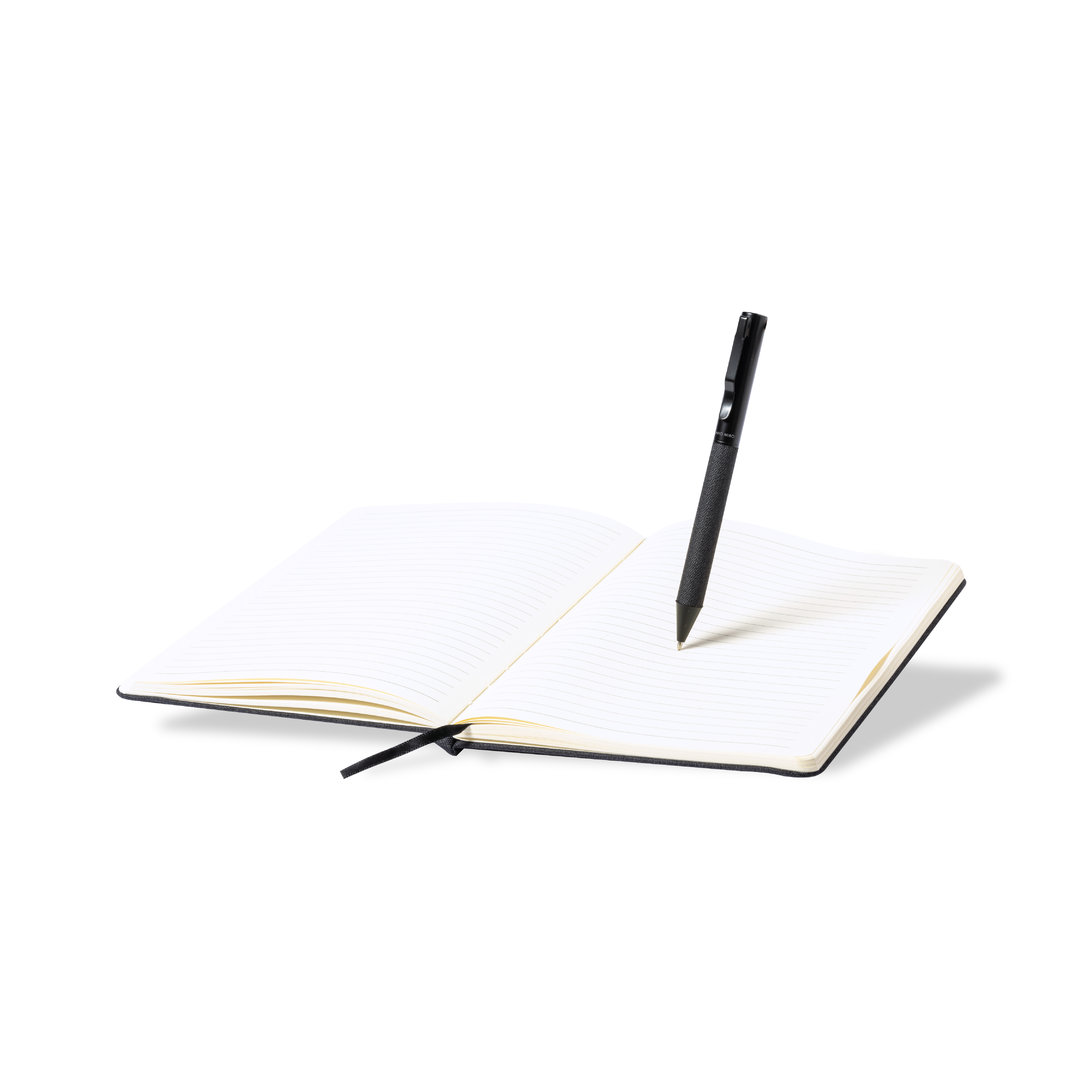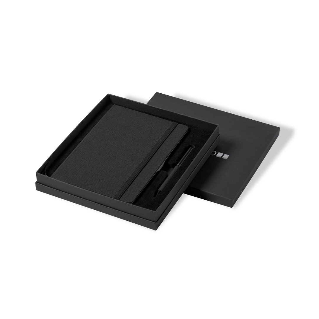 Set de bloc de notas y bolígrafo de Antonio Miró. Incluye: Bloc de notas de elegante acabado en negro, fabricado en resistente poliéster 300D, con tapas rígidas y elástico de sujeción a juego. Interior con 100 hojas de disposición a una raya. Bolígrafo metálico de mecanismo giratorio y en tinta azul. Con cuerpo y detalles en negro, clip metálico y logotipo de la marca. Set presentado en elegante y resistente caja individual negra con logotipo Antonio Miró y funda de protección a juego. Bloc Portada Rígida. 100 Hojas. Bolígrafo Incluido