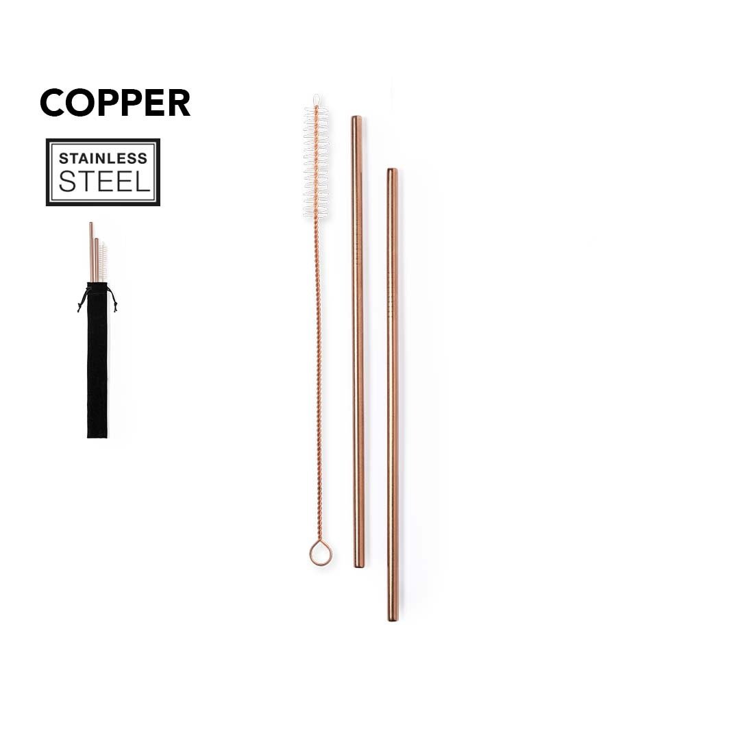 Set de pajitas de 2 piezas fabricadas en acero inox con recubrimiento exterior de cobre galvanizado. Con cepillo limpiador incluido y presentadas en funda de antelina negra con cordón de cierre. 2 Piezas. Reutilizable. Limpiador Incluido. Funda Antelina