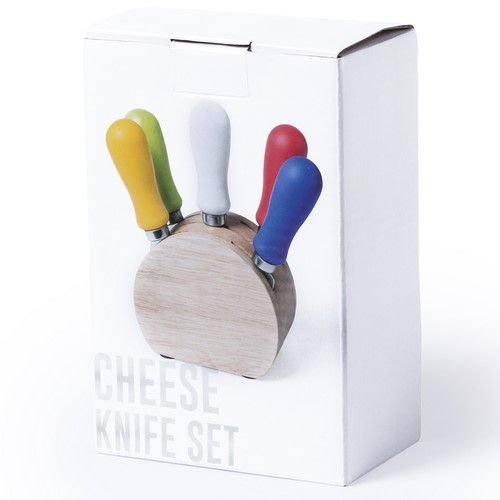 Set para quesos de 6 piezas. Con cuchilla en acero inox y mango ergonómico en variada gama de vivos colores. En base de madera natural con superficie antideslizante y presentado en atractiva caja de diseño. 5 Piezas