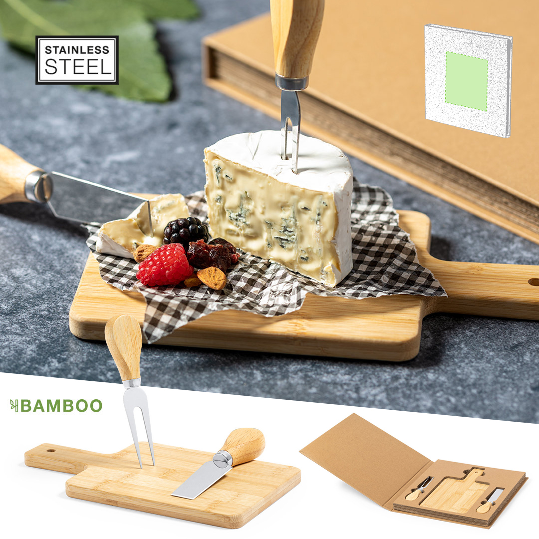 Completo set de quesos de línea nature, fabricado en bambú y acero inoxidable. Incluye tabla de corte y presentación con mango y agujero para colgar, trinchador y cuchillo. Presentado en estuche individual troquelado de cartón reciclado acabado kraft. 3 Piezas