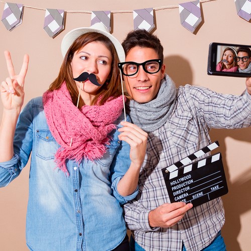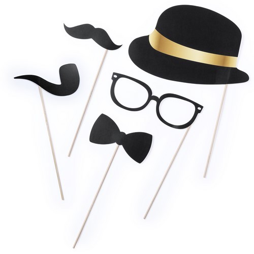Set selfie de 5 piezas con divertidos accesorios sombrero, pipa, bigote, palomita y gafas. En papel de alto gramaje con mango de madera. Presentado en atractiva bolsa de diseño con auto cierre. 5 Piezas