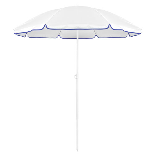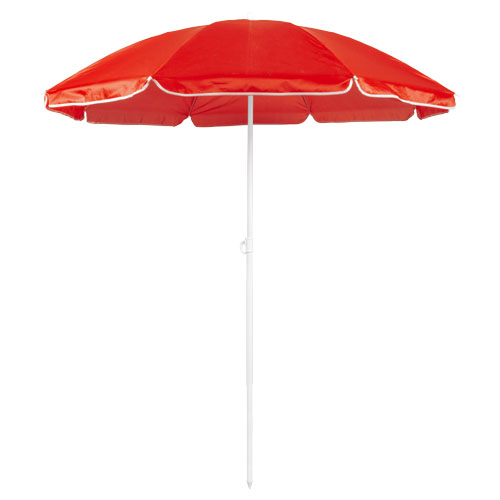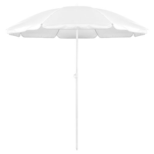 Sombrilla de playa de 8 paneles de resistente nylon en variada gama de vivos colores. De 150cm de diámetro, con faldones laterales ribeteados, tubos metalizados en color blanco y ajustable en altura. Presentada en funda de PVC con cinta de transporte para hombro. Funda PVC