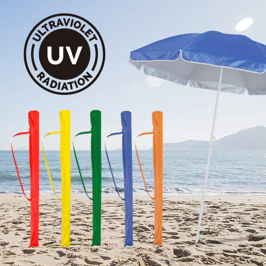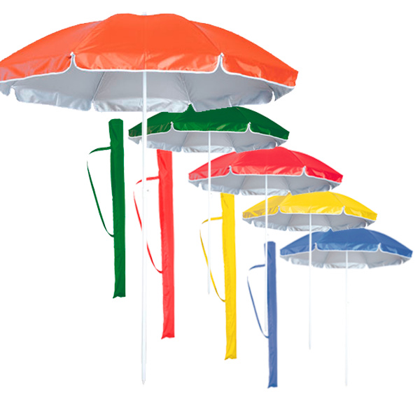 Sombrilla de playa de 8 paneles de resistente nylon e interior en color gris plateado con protección UV. En variada gama de vivos colores, de 150cm de diámetro, con faldones laterales ribeteados, tubos metalizados en color blanco y ajustable en altura. Presentada en funda de nylon con cinta de transporte para hombro. Protección Rayos UV. Funda Nylon