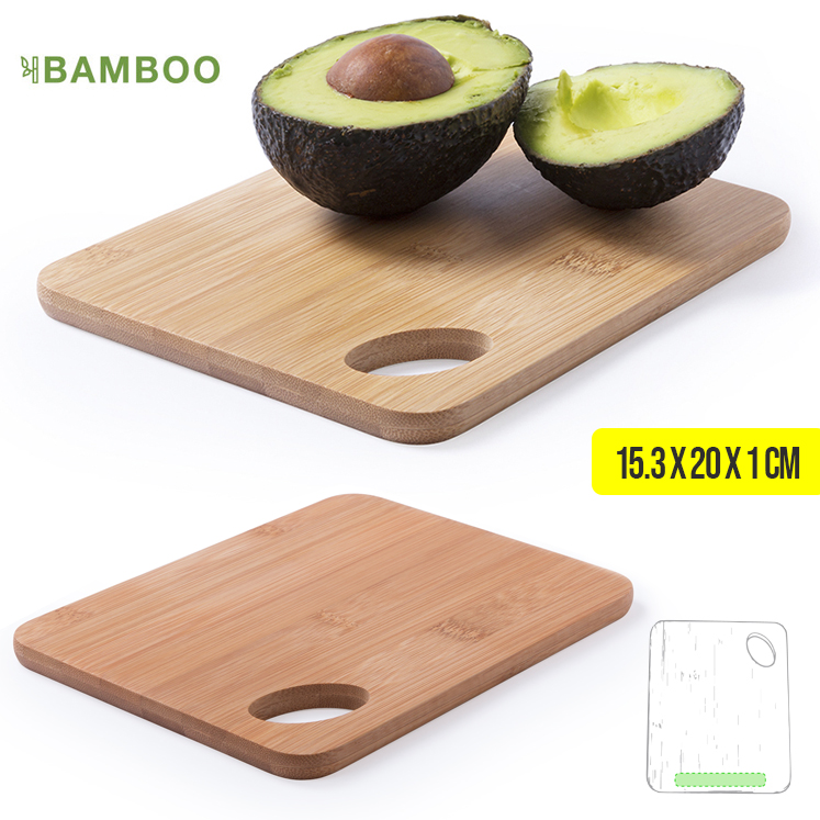 Tabla en madera de bambú, de suave y resistente acabado. Con troquelado para fácil manejo.