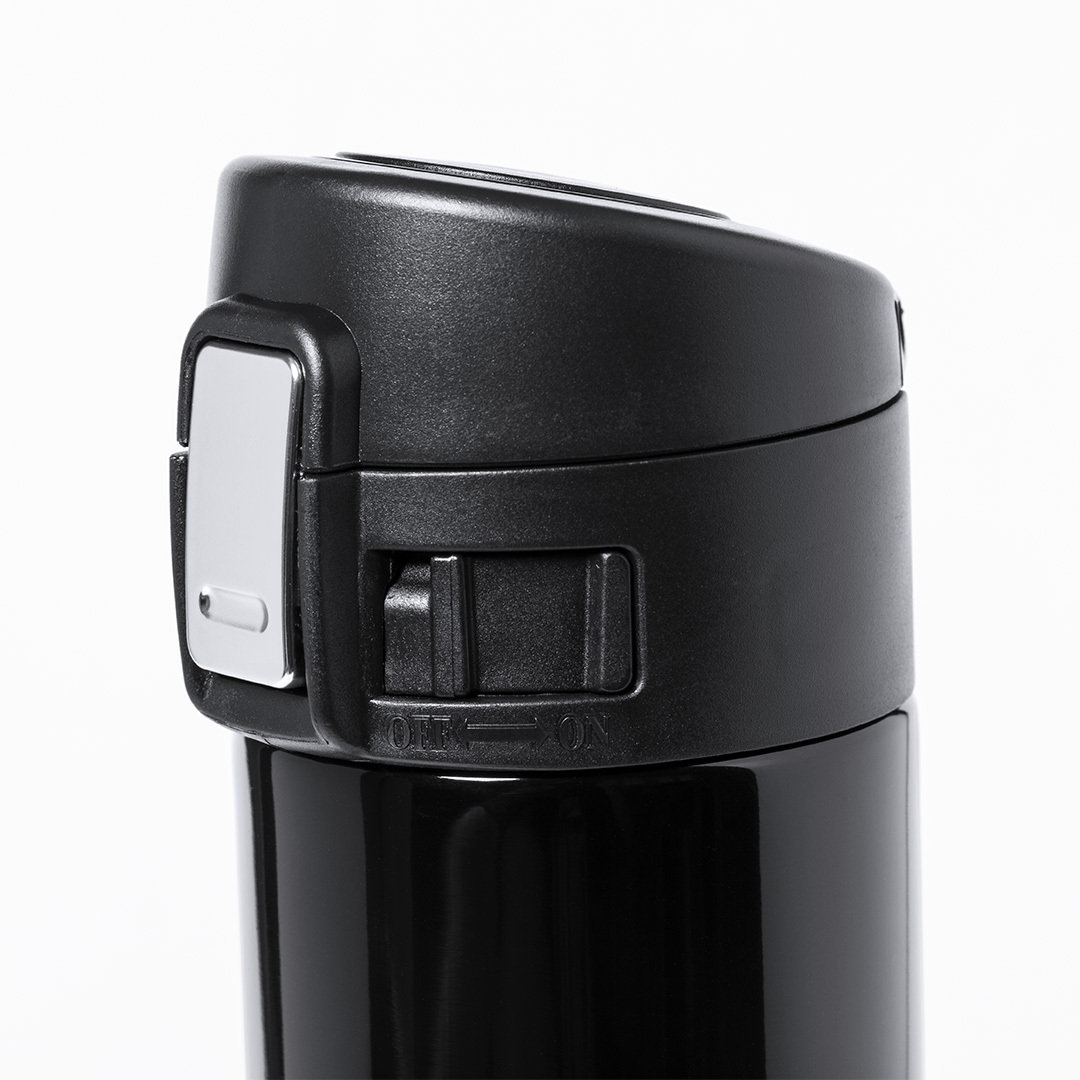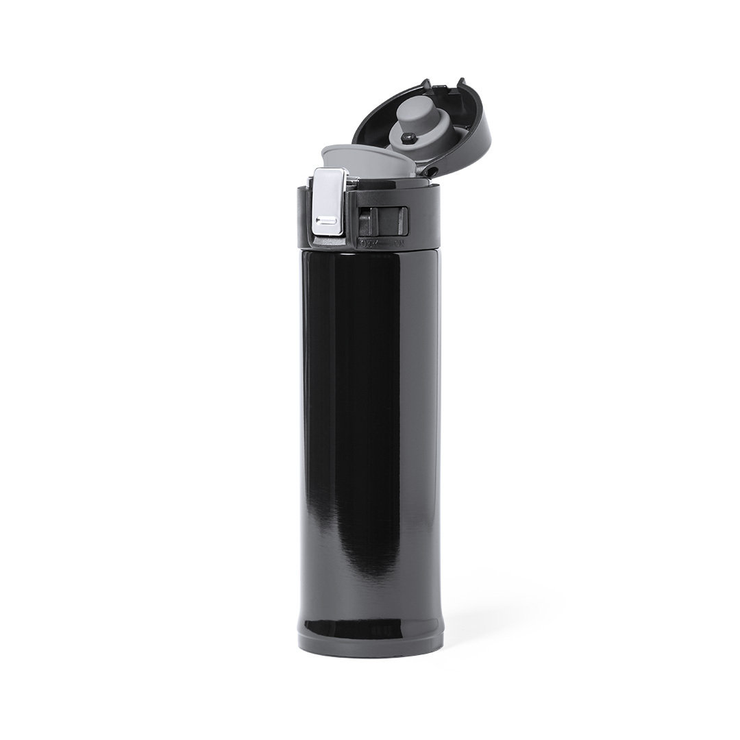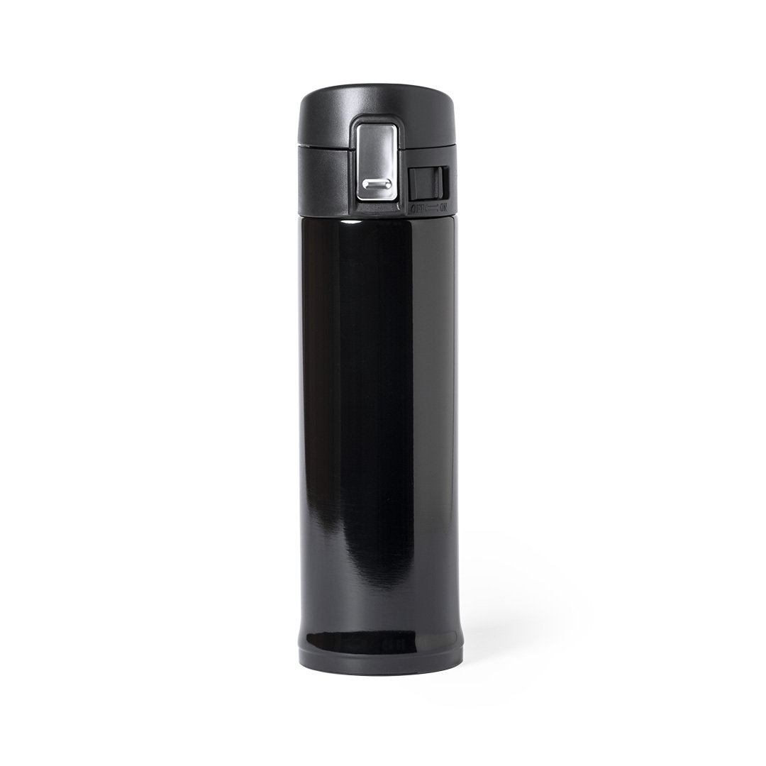 Termo en alta calidad acabado en acero inox, de doble pared. 450 ml de capacidad, con tapón de seguridad y botón de bloqueo de apertura. Disponible en variada gama de colores y presentado en atractiva caja de diseño. 450 ml