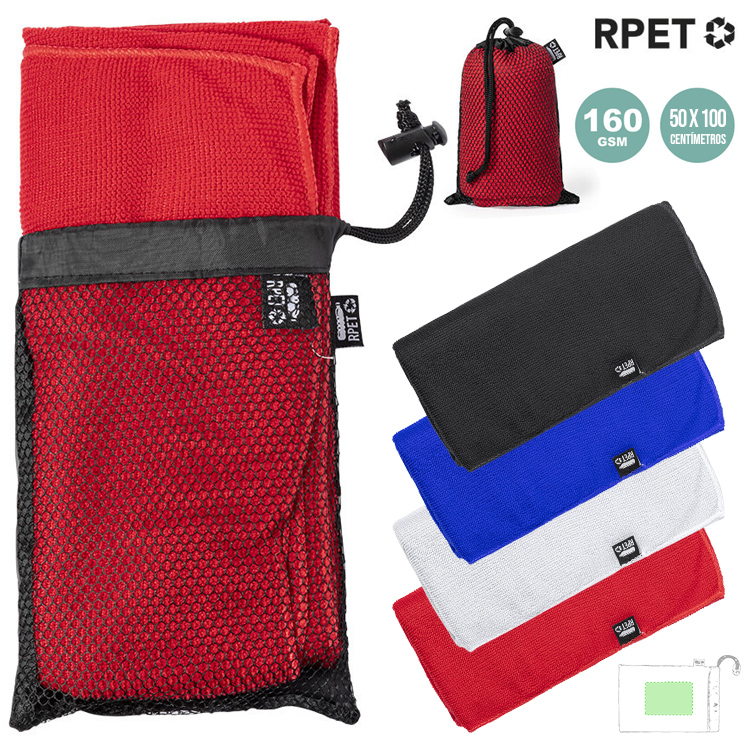 Toalla absorbente de línea nature. Fabricada en RPET de 160g/m2, elaborado a partir de plástico reciclado para así fomentar la reutilización de residuos plásticos y contribuir a la sostenibilidad del planeta. Tamaño 50×100 cm, presentada en funda individual de redecilla RPET con parte trasera lisa y disponible en variada gama de colores. Con distintivo RPET en etiqueta. Funda Poliéster RPET