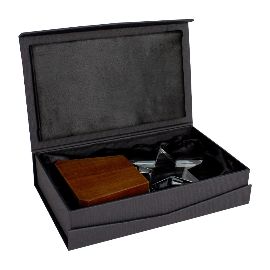 Elegante Trofeo modelo “Lonely Star”, base de madera barnizada y estrella de cristal en su parte superior. Presentación en caja de cartón forrado negro con cierre imantado, interior acolchado de espuma y tela poliéster satinado negro, con troquel.