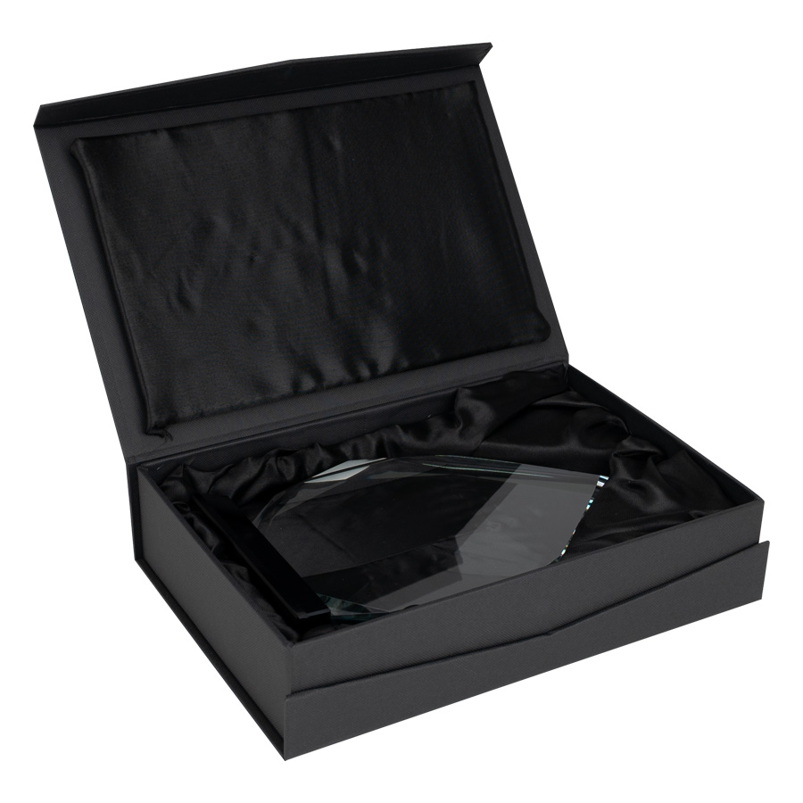 Elegante Trofeo Galvano de Cristal modelo “Tear”, con base de cristal negro. Presentación en caja de cartón forrado negro con cierre imantado, interior acolchado de espuma y tela poliéster satinado negro, con troquel.