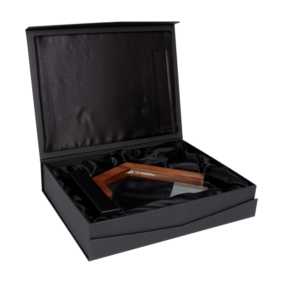 Elegante Trofeo modelo “Mercx”, en madera barnizada y cristal, con base de mármol negro. Presentación en caja de cartón forrado negro con cierre imantado, interior acolchado de espuma y tela poliéster satinado negro, con troquel.