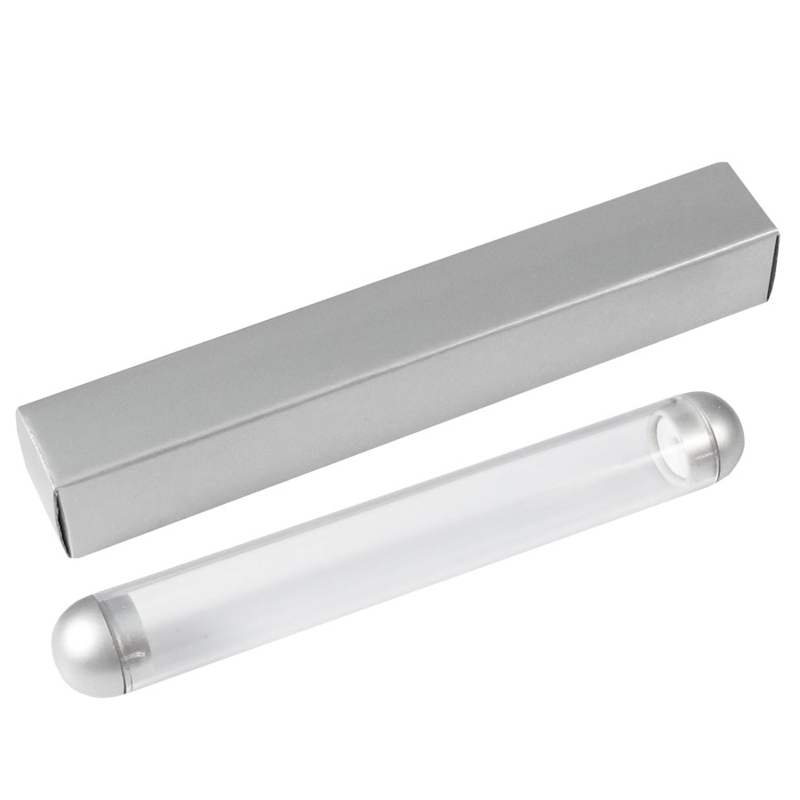 Tubo de Acrílico traslúcido para 1 bolígrafo. Tapas plateadas con superficie redondeada. No incluye Bolígrafo.
